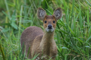 The Chinese water deer (Hydropotes inermis) is a unique and fascinating species, notable for its distinct characteristics that set it apart from other deer. Native to the river valleys, marshes, and wetlands of China and Korea, these small deer are most recognizable for their lack of antlers and their prominent tusks, which resemble those of a saber-toothed cat. These tusks, actually elongated canine teeth, are more pronounced in males and are used during mating displays and territorial disputes.
